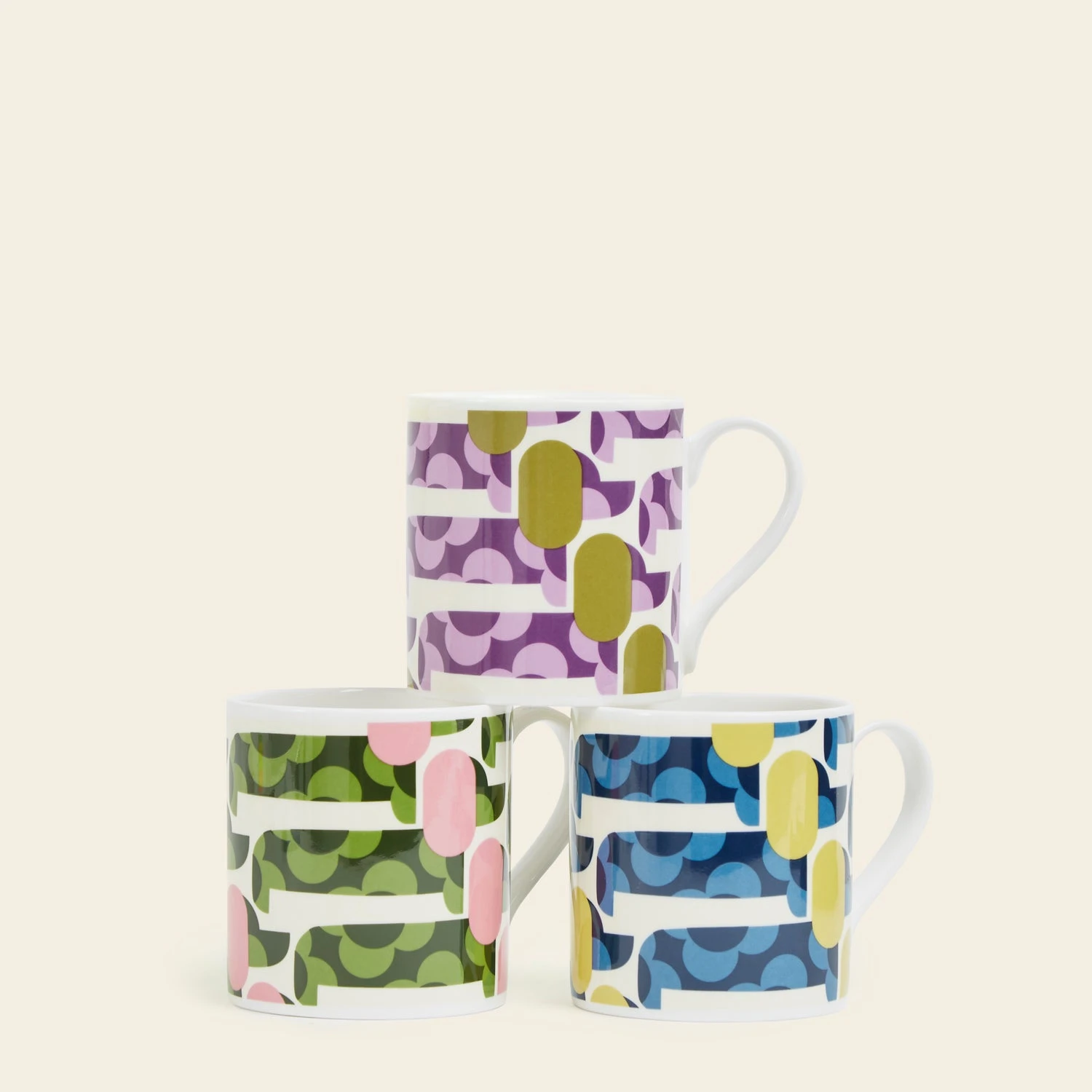 Orla Kiely mugs are made using traditional screen-printing techniques for long lasting, vibrant colours. The decals are then applied carefully by hand in Scotland, and re-fired in kilns overnight for a colourful, durable finish.
